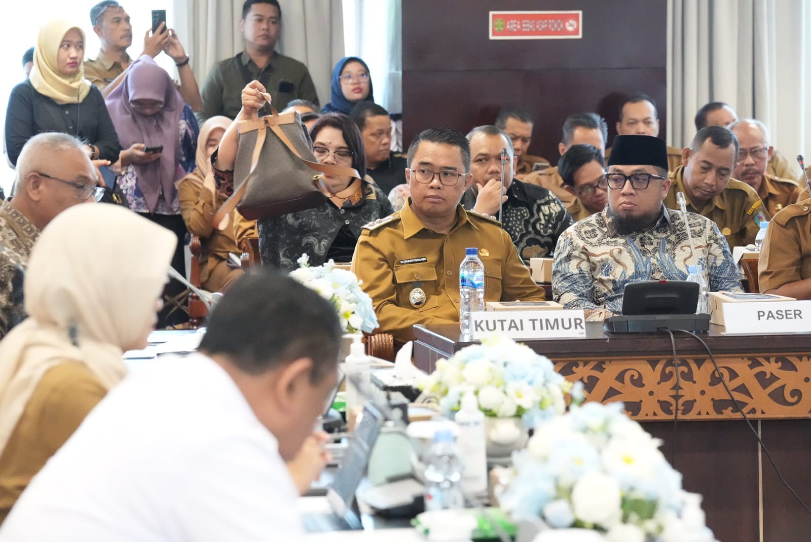 Pertemuan yang digelar di Ruang Ruhui Rahayu, Kantor Gubernur Kaltim, Selasa (5/8/2025), dibuka langsung oleh Gubernur Kaltim H Rudy Mas’ud secara daring dari Jakarta. Hadir secara luring Wakil Gubernur Kaltim H Seno Aji, Sekretaris Provinsi Sri Wahyuni, serta kepala daerah se-Kaltim, termasuk Wakil Bupati Kutai Timur (Wabup Kutim) H Mahyunadi bersama Kepala Dinas Tenaga Kerja dan Transmigrasi Kutim Roma Malau, Kepala Badam Pendapatan Daerah Kutim Syahfur, Kepala Dinas Ketahanan Pangan Kutim Ery Mulyadi, Kabag Ekonomi Setkab Kutim.Vita Nurhasanah. Kegiatan dimulai sejak pukul 08.50 WITA dan dihadiri pula oleh perwakilan Forkopimda, BUMN, BUMD, serta pelaku usaha.