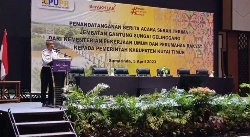 Berita3.net, SAMARINDA – Bupati Kutim Ardiansyah mengatakan menurut Inpres Nomor 3 Tahun 2023 tentang Percepatan Peningkatan Konektivitas Jalan Daerah, menyebut bahwa jalan provinsi dan jalan daerah juga menjadi tangung jawab Kementerian Pekerjaan Umum dan Perumahan Rakyat (PUPR) melalui Balai Besar Pelaksanaan Jalan Nasional (BBPJN) Kaltim. Hal itu ia ungkapkan saat memberikan sambutan dalam momen penandatanganan naskah hibah dan berita acara serah terima barang milik negara (BMN) Jembatan Gantung Sungai Gelinggang dari Kemen PUPR RI di Ballroom Hotel Mercure, Rabu (5/4/2023).