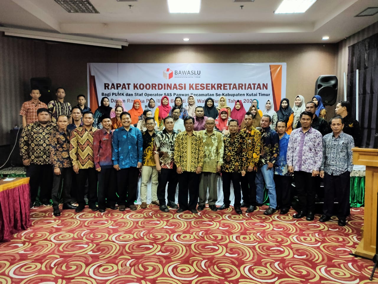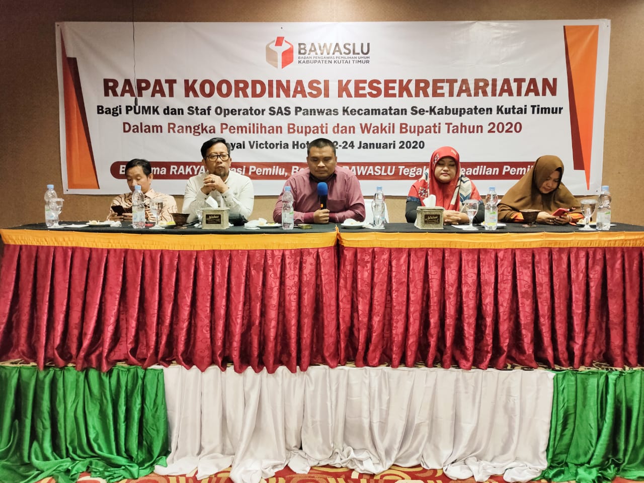 Berita3.net, Sangatta –Mengawali tahun 2020, Badan Pengawas Pemilihan Umum (Bawaslu) Kutai Timur mengelar kegiatan Rapat Koordinasi Kesekretariatan bagi PUMK dan Staf Operator SAS Panwas Kecamatan Se Kabupaten Kutai Timur, Rabu (22/01/2020).