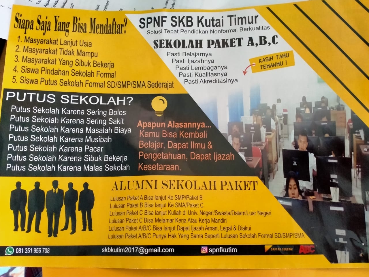 Berita3.net, Sangatta – Unit Pelaksana Teknis Satuan Pendidikan Non Formal (UPT-SPNF) SKB Kutai Timur kembali membuka pendaftaran untuk wilayah Kabupaten Kutai Timur.