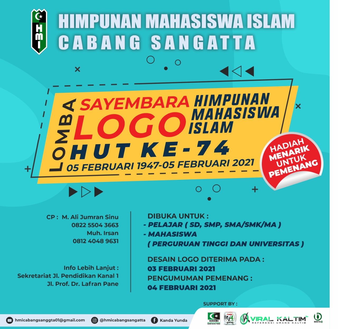 Berita3.net, Sangatta – Dalam Rangka Menyambut Milad ke 74 pada tanggal 5 Februari 2020, Himpunan Mahasiswa Islam (HMI) Cabang Sangatta gelar berbagai kegiatan. Salah satu diantaranya lomba Desain Grafis Logo Milad HMI yang Ke 74 untuk pelajar dan Mahasiswa.