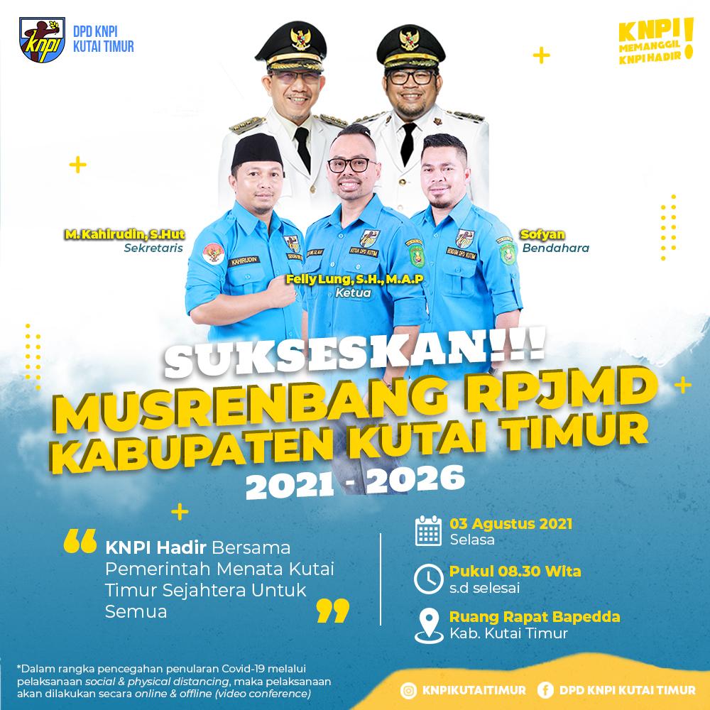 Mendapat undangan resmi, Ketua DPD KNPI Kutim Felly Lung, S.H., M.A.P pun hadir secara online dalam Musrenbang RPJMD dalam implementasi Visi dan Misi Bupati dan Wakil Bupati terpilih. Bapak Drs. H. Ardiansyah Sulaiman, M.Si dan Bapak DR Kasmidi Bulang, S.T., MM.