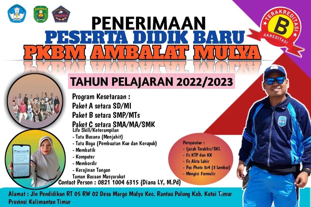 Berita3.net, Sangatta –PKBM Ambalat Mulya merupakan salah satu satuan Pendidikan nonformal yang berada di kecamatan Rantau Pulung yang menyelenggarakan program layanan Kesetaraan Paket A (Setara SD), Paket B (setara SMP) dan Paket C (setara SMA). Selain program Pendidikan Kesetaraan PKBM Ambalat Mulya juga menyelenggarakan program Kursus/Keterampilan Tata Busana (Menjahit), Kampung Literasi dan juga Taman Baca Masyarakat (TBM). Adapun visi PKBM adalah “Mewujudkan SDM yang unggul, cerdas, kreatif, terampil, dan siap menghadapi tantangan dunia usaha dan dunia insdutri (DUDI)”.