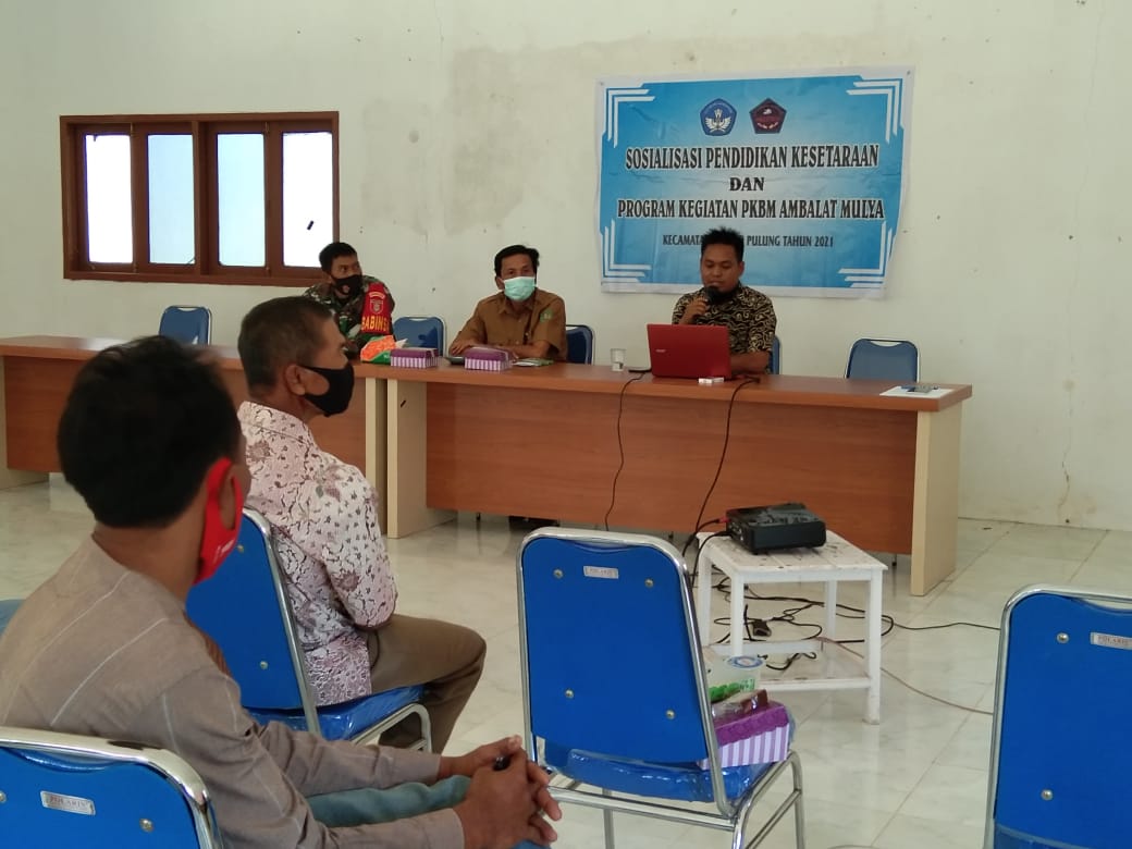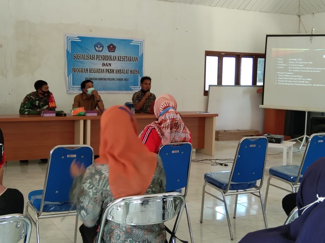 Maka dari itu , PKBM Ambalat Mulya melakukan sosialisasi terkait Pendidikan kesetaraan dan program kegiatan pkbm yang diselenggarakan. Sosialisasi ini dilaksanakan pada hari Senin, 15 Maret 2021 di aula pertemuan desa Margomulyo. Kegiatan ini dihadiri oleh jajaran pemerintah desa, anggota BPD, Babinsa, ketua RT, LPM, KPM dan tokoh masyarakat. Sosialisasi ini dimaksudkan selain sebagai ajang silaturahin juga memberikan pemahaman akan pendidikan kesetaraan dan menjelaskan program-program PKBM Ambalat Mulya yang selama ini sudah terlaksana.